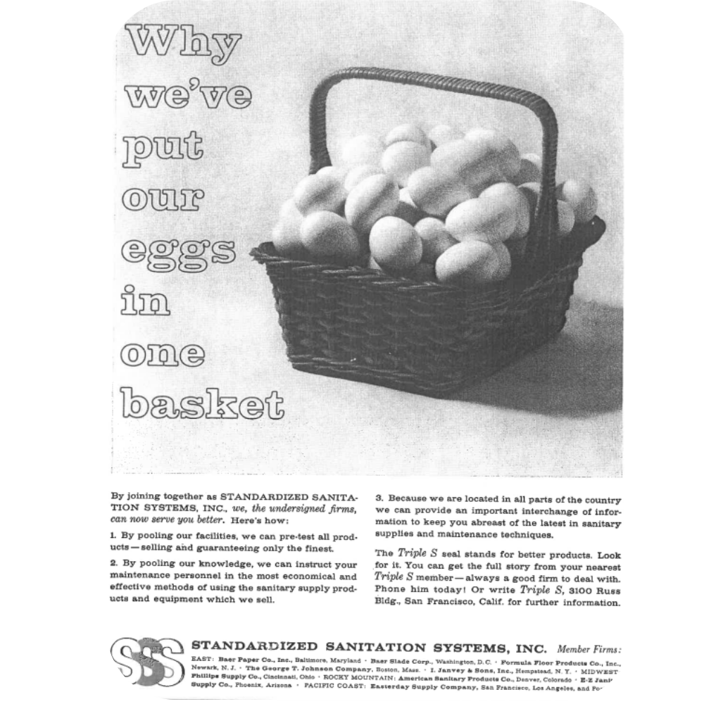 After several years of planning, the vision became reality. In 1960, Standardized Sanitation Systems was officially incorporated with bylaws, a name, and a logo. A unique first ad campaign titled “All our eggs in one basket” captured the cooperative essence of the organization. Four founding Members and six invited Members united to create a model unlike anything else in the industry, one that prioritized Member success through shared strength.